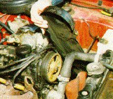 I know more people who have ruined car engines by failing to get the cam belt changed on time than any other mechanical problem. The Capri's cam belt should be changed every 50,000 miles to be on the safe side. If the belt snaps when the car is at speed, you will only damage the pistons and valves if you're lucky. Changing the belt is a fairly major job but it's a lot easier than you would imagine. See my other 'jobs' page for the gruesome details. I suggest for the service, you remove the cam belt cover which is the metal cover in between the front of the engine and the radiator fan (it has three 10mm bolts securing it.