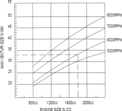 Chart Showing Main Venturi Sizes for Various Engine sizes and RPM ranqes