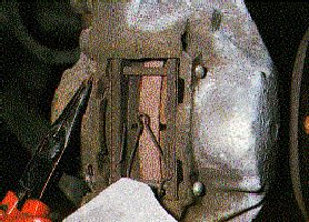 At this point, you should be prepared to catch the anti-clatter spring that clips on the back of the pads. Make sure all these small items are stored safely. All that is required now is to replace the pads. To remove the shoes, try gripping the back of the shoe with a pair of mole grips and pulling it gently. With a bit of shaking and tugging, the pad will slowly but surely work its way out together with its anti-squeal metal shim on the back. Repeat for the second pad. The new pads will be very much thicker than the old ones and you will find it impossible to get them back in without opening the calliper piston. You will need a thin piece of wood something like a hammer handle. Place it in the hole where the pad went, and lever it against the piston. Warning ! Keep an eye on your brake reservoir as you do this as the fluid may rise up and leak out. Place a rag around the top of the reservoir to be on the safe side. The piston should move inwards very slowly; you may have to use quite a bit of leverage to do this. Push it in as far as you can so that there is now enough room for the new brake pad to be inserted. Before you fit the pads, I recommend putting either some copper grease on the back of the pad or using one of those sticky anti-squeak pads. This will prevent your car from having squealing brakes.