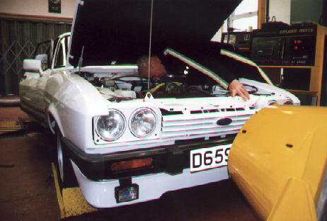I had my Capri set up by Peter Baldwin at Wilshers Garage in Wimpole, near Cambridge. Peter took quite some tracking down as he used to be based at Marshall's in Cambridge where he was quite well known for his racing of Minis. So I had to ask around before locating him. In fact rolling roads are not easy to find and they are few and far between (See the technical article on how they work).