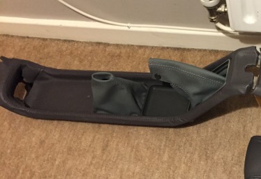 Front centre console with new stitched leather skin, gear lever & hand brake gaiter. Clock area still to be trimmed before refitting.